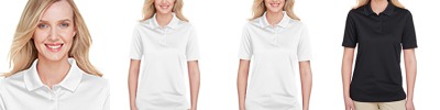 6.6 oz./yd² / 225 gsm, 100% polyester jersey; Snag protection plus; Moisture-wicking; Antimicrobial performance; UV protection; Matching flat knit collar; Side vents; 4-button placket with dyed-to-match buttons; Narrow placket for femine look; Industrial Laundry Tested to 75 washes;